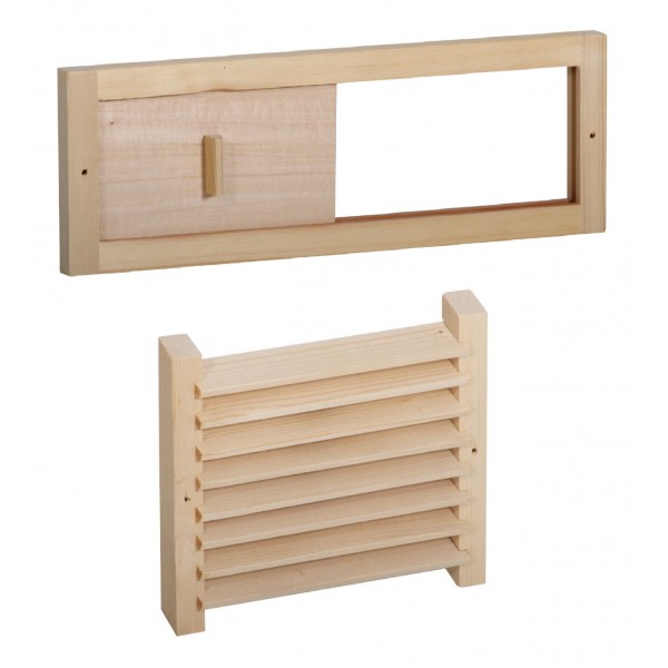 Set grilaj de ventilatie pentru perete fabricata din lemn de molid folosita la aerisirea cabinelor de sauna Finlandeza. Grila de ventilatie pentru sauna cuprinde doua componente: