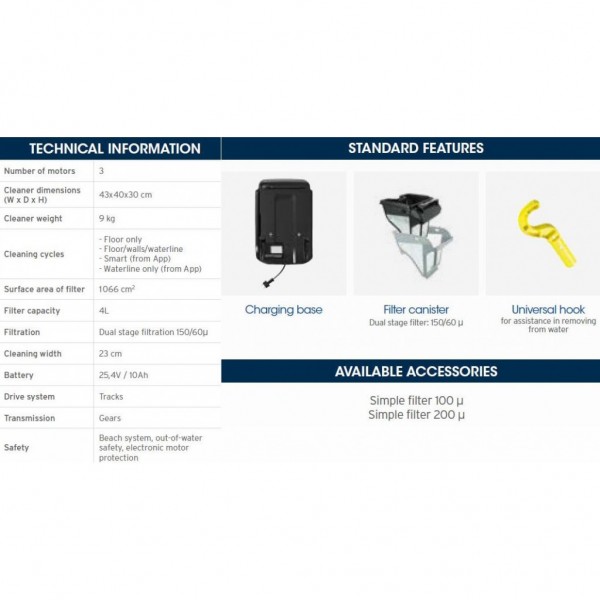 Un robot de curatat fara fir pentru piscina echipat cu o baterie litiu-ion de mare putere care ofera o curatare excelenta fara interventie din partea utilizatorului. Foarte eficient, usor de manevrat si fara cabluri, este remarcabil de agil si ajunge in cele mai stranse colturi de pe toate tipurile de suprafete de piscina.